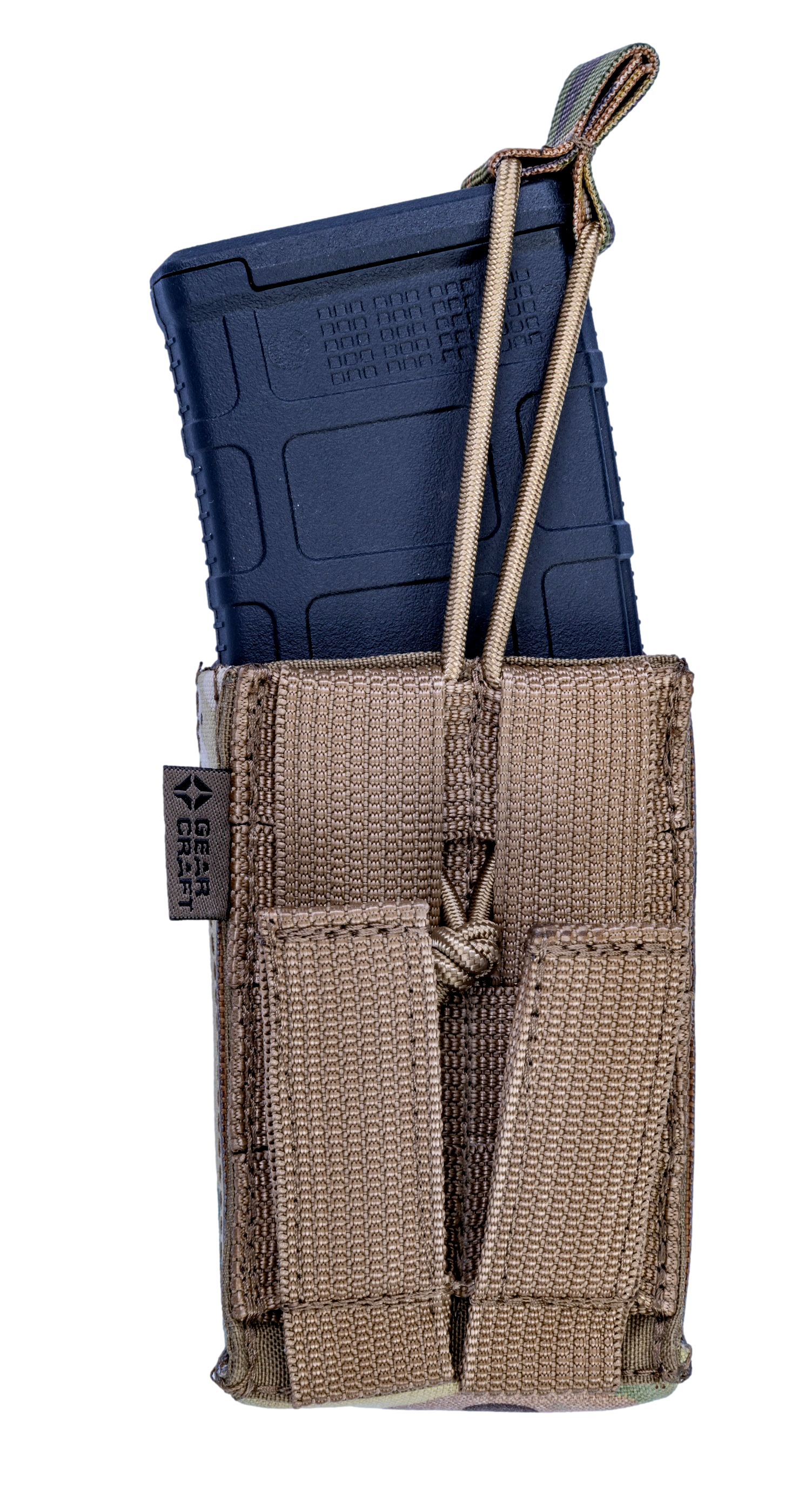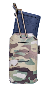 Подсумок предназначен для транспортировки магазинов форм-фактора PMAG, STANAG и схожих по габаритам. В боках между двумя слоями ткани подсумка вшит пластик, формирующий элемент жёсткости. Это даёт возможность извлекать магазин под разными углами, так как зуб магазина идет по боковой части подсумка как по направляющим.